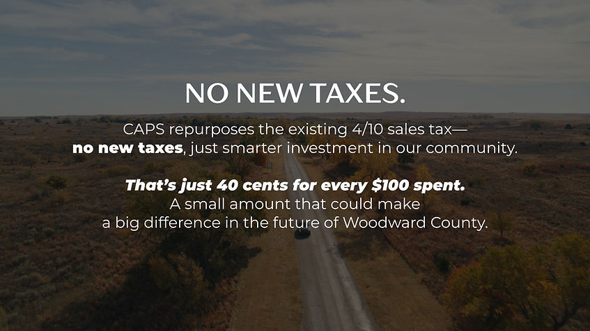 If approved by voters, the new CAPS proposal would not be a sales tax increase. Instead, it would repurpose the existing tax beginning in October 2026 to support economic development initiatives, community facilities, and long-term maintenance and operations — all aimed at strengthening Woodward County’s future.